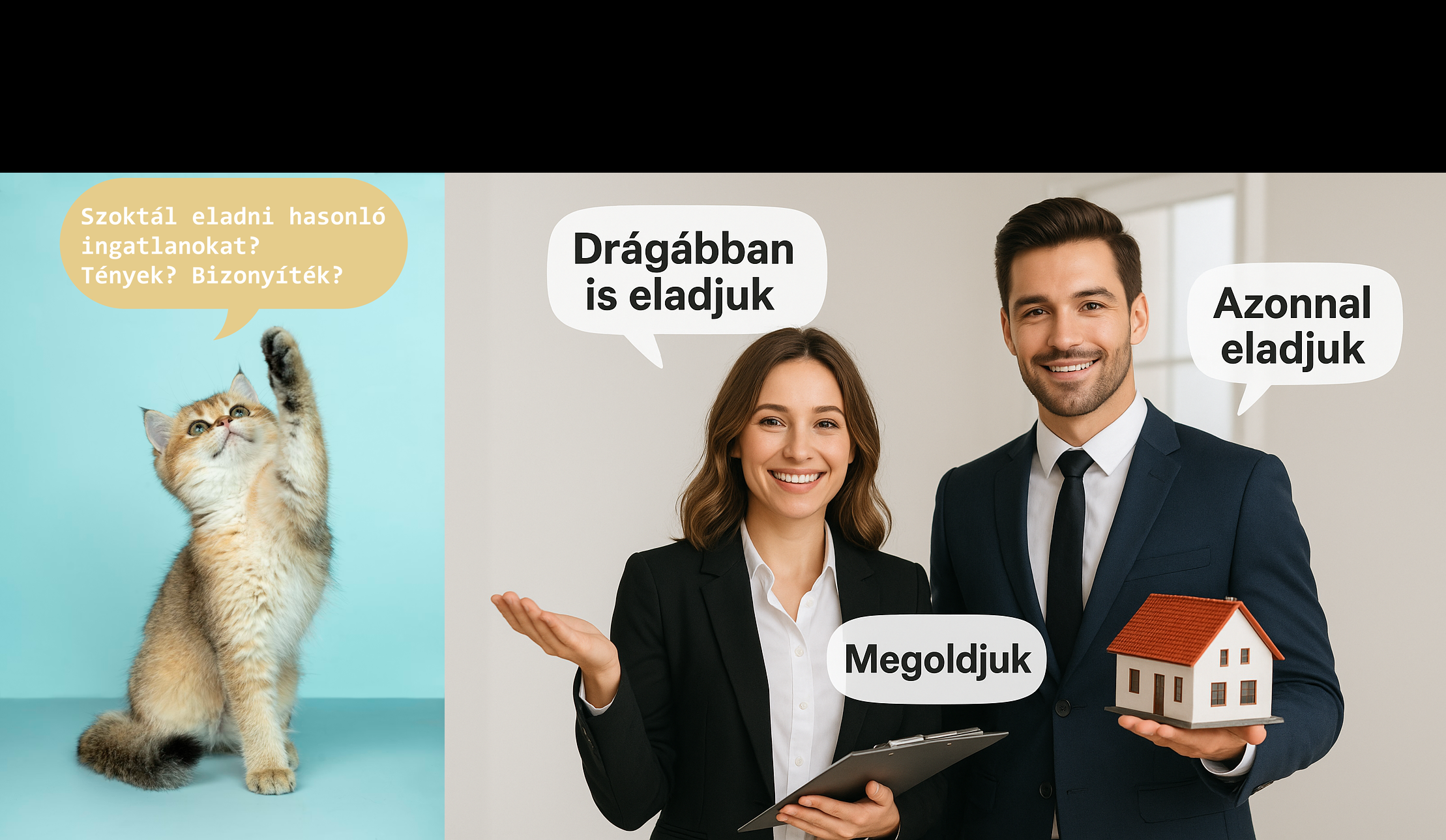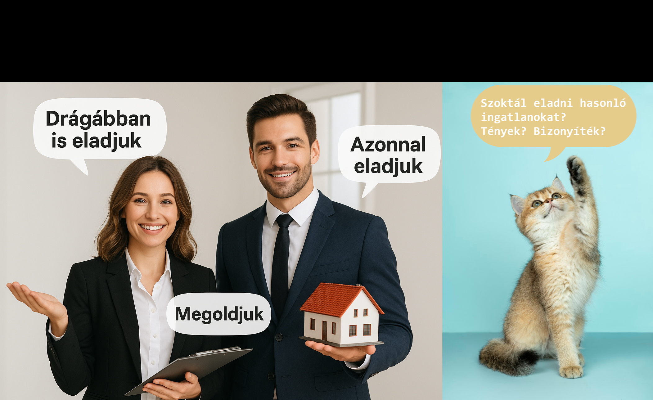 • Az eladó ingatlan tulajdonosa pedig olyan ingatlanost kap, aki dárgábban, gyorsabban el tudja adni, mint Ő maga, vagy mint, ha más ingatlanost választott volna. És ez neki semennyivel nem kerül többe, mint, ha a rámenősség, vagy a felelőtlen ígéretek győzték volna meg.